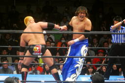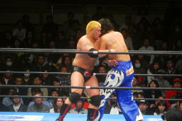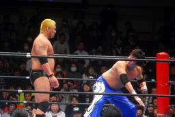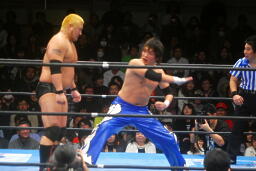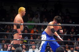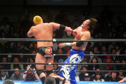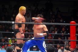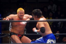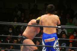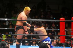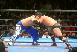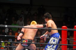 火野ガットショット、ヘッドロック。滝澤ロープに振る、ショルダーブロックの打ち合い(右写真)。