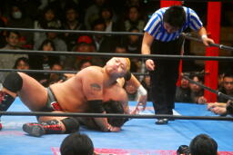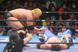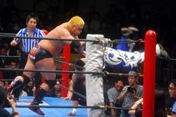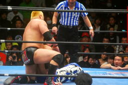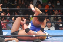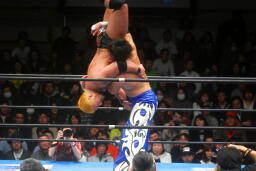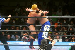 滝澤ボディスラム狙う、火野ブロック(左写真)。