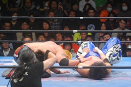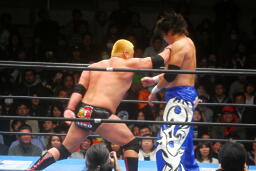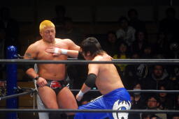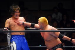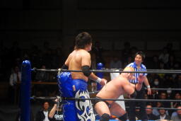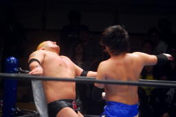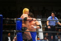ロックアップでスタート(右写真)、火野がロープに押し込んで逆水平、滝澤かわす。