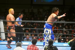 滝澤肩口に逆水平打ち込んで火野を突き落とす(右写真)。