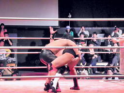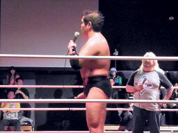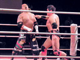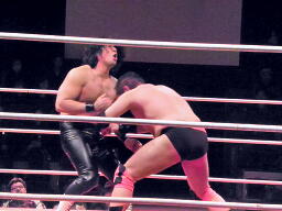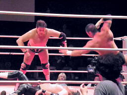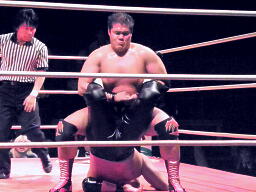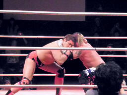 先発は葛西と橋。葛西タックル、橋かわす。手四つは葛西が嫌う。ロックアップ(右写真)、橋ロープに押し込む、クリーンブレーク。再度ロックアップ、また橋がロープに押し込む、葛西が体勢入れ替えて張り手。橋も張り手打ち返す。