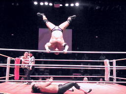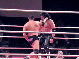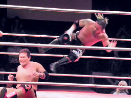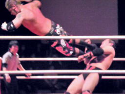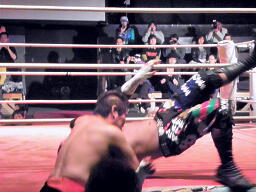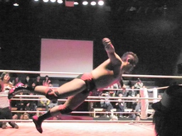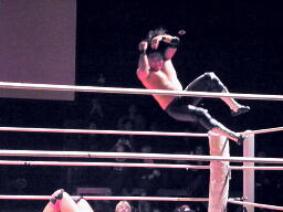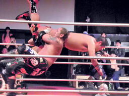 葛西コーナーに振る、橋切り返す、葛西エプロンに出てハイキック、コーナーに上ってミサイルキック(左写真)、カウント2。
