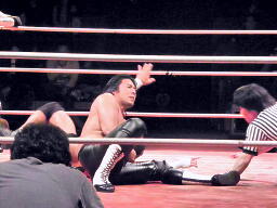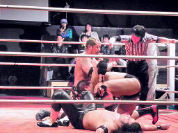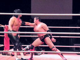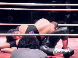 橋の倒れ込みヘッドバットと東郷のフィストドロップが同時に炸裂(右写真)、橋がカバー、カウント2。