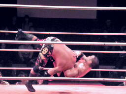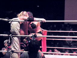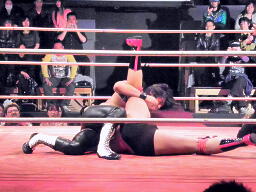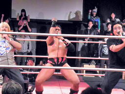橋「3、2、1、ボッキン、ボッキン」をやらされる(右写真)。前回見た時はメイド服、今回はボッキン、ボッキンといいようにいじられてる感もなくはないが、橋の「開き直り」はいいと思う。これだけの体格があって、ちょっともっさりしてるとこさえ除けば十分インディー勢には脅威の体力もあるんだから、まだまだオファーあるんじゃなかろうか。。
