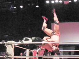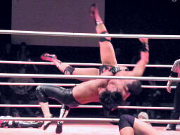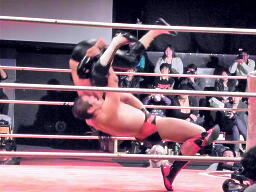 橋キャッチしてリバースDDT、葛西がエプロンに逃げる。橋エプロンから奈落式でもう一発リバースDDT(右写真)。
