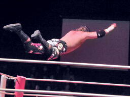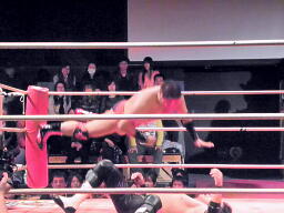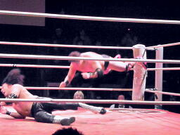 コーナーに上ってダイビングエルボードロップ(右写真)、カウント2。