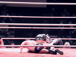 東郷ガットショット、ナックル、コーナで踏みつけ。首投げからニースタンプ、アームロックに。ホイップしてアームロックとヘッドシザーズの複合技に(左写真)。GENTAROヘッドシザーズで切り返す、東郷首を抜いて脱出。5分経過。