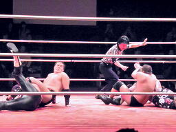 葛西ヒザ蹴り、ロープに飛んでラリアット、橋かわして投げっ放しジャーマン(右写真)、東郷にタッチ。