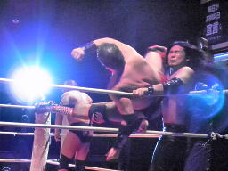 ボディスラムで投げて東郷がコーナーからダイビングボディプレス、橋もコーナーからダイビングヘッドバット(右写真)、葛西カット。