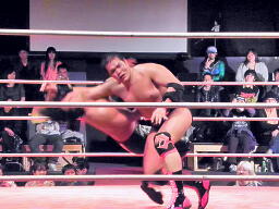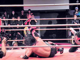 ロックアップ、GENTARO首投げからケサ固めに(右写真)。橋がヘッドバットでカット。GENTAROは葛西にタッチ。東郷エルボースタッブ連打、逆水平。対角線コーナーに振って串刺しエルボー。ボディスラム、ドロップキック、橋にタッチ。