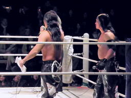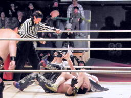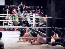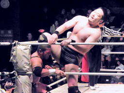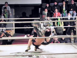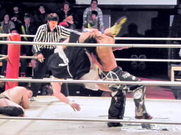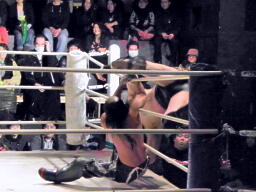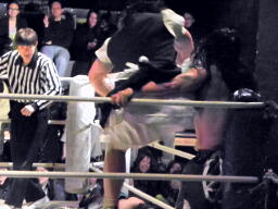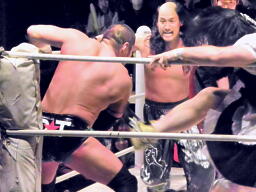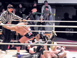 東郷がバラモン兄弟のダブルドロップキックを受けて(左写真)10カウント以内にリングに戻れず失格となる。