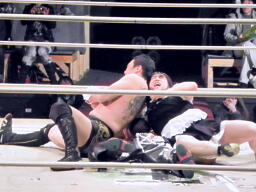 シュウが東郷を場外に落とす(左写真)。