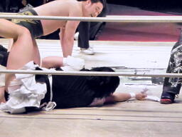 場外カウントが進み、みんな戻る。耕平が封筒を持っている、光留が襲い(右写真)、封筒を奪い取る。