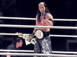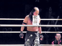 シュウ「ルールは俺が考えてきた」(右写真)とルールブックを新藤リングアナに渡して読み上げさせる。それによると、フォール、ギブアップによる決着はなく、会場のあちこちに置かれた封筒の中から「佐藤」と書かれた紙の入ったのを見つけ、レフェリーに提示した者が勝者となり、初代世界佐藤級王者としてベルトとトロフィが授与される、と。なお場外カウントは10で、10以内に戻れなかった選手はその時点で失格となる。