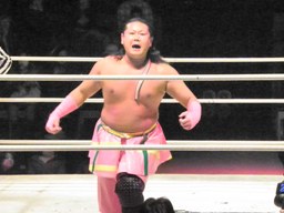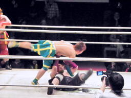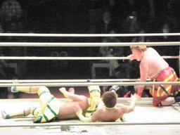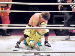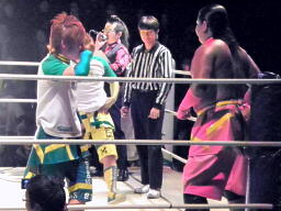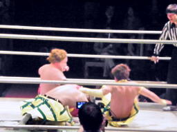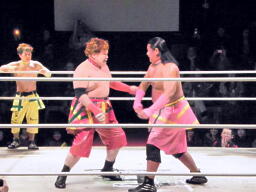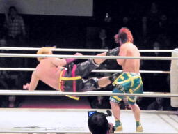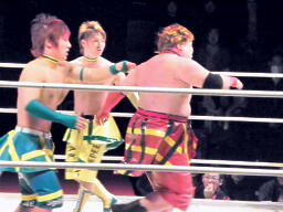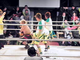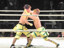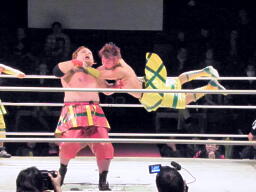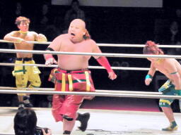 ルチャっぽいこかし合い(右写真)、オースギと沼澤にタッチ。