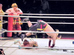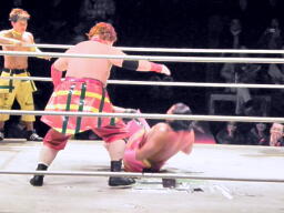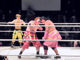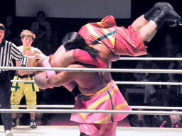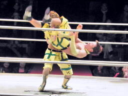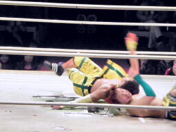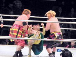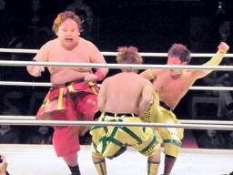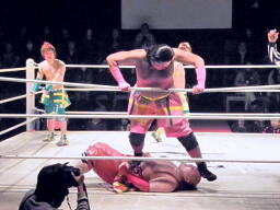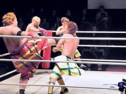 小林とサトウがダブルのブレーンバスターでオーワシを投げようとする、オーワシブロック、Speed of Soundsを呼びこんで3人で投げる(右写真)。Sound of Silenceは場外エスケープ。