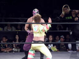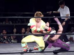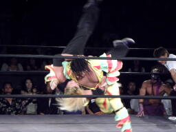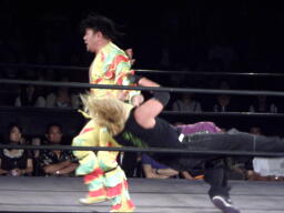 ロープワークからアームドラッグの打ち合い(左写真)、足のすくい合い、ヘッドスプリングで両者起きる。起こる拍手に政宗は「(千賀)そんなにうまくねーぞ。」両軍タッチ。