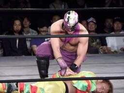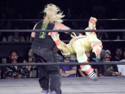 当初UWAタッグ選手権だったこの試合、オースギの欠場で代わりに福田が入ったはいいが、まさかロス・サルセロス・ハポネセスで来るとは(右写真)。
