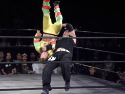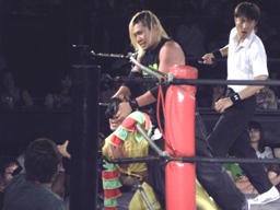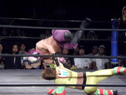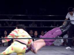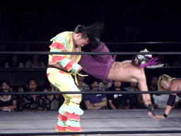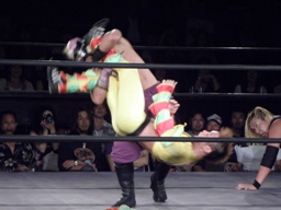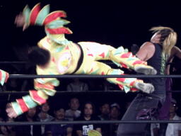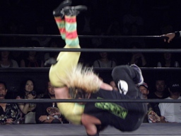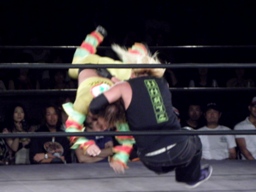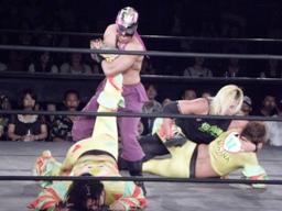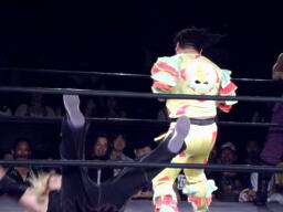 千賀コーナーに振って串刺しエルボー、コーナーに上ってクロスボディ(右写真)、政宗下から迎撃しようとするが千賀は押し潰す。カウントは2。