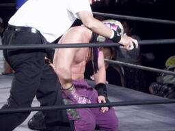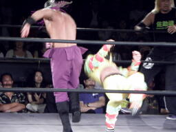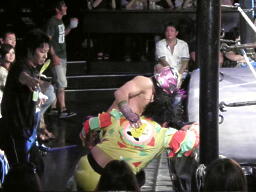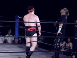 藤田は千賀をロープに固定してサミング、セコンドに付いていたオースギに「オラ助けに来いよ、普通の人!」(右写真)オースギが迫ると政宗が回りこんでパンチ。藤田は鉄柱にぶつける。オースギ場外でダウン。