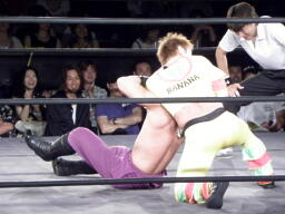 政宗ハンマーロック(右写真)、両者立ち上がる。政宗ネックロック、首投げ、千賀切り返してハンマーロックに、政宗回転して脱出。