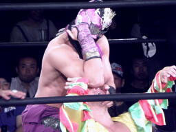 先発は千賀と政宗。政宗足をすくって倒す、千賀逃げる。手四つ、千賀が腕を取って倒し(左写真)ケサ固めに。政宗エビ固め、カウント2。