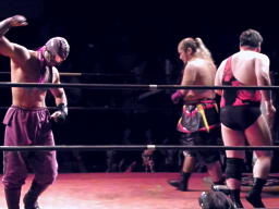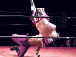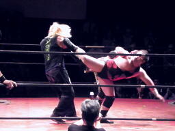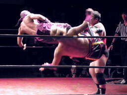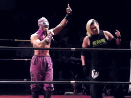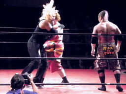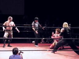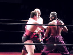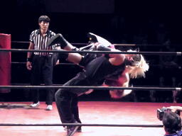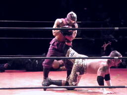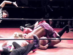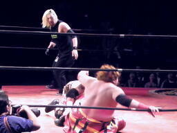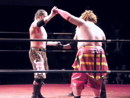 沼澤と小林ロープに飛ぶ、藤田が沼澤の足を引っ張る、そして政宗が小林に首固め(左写真)、カウント3。