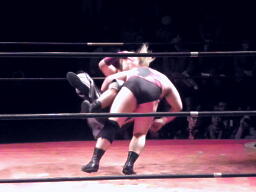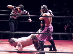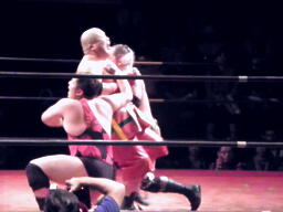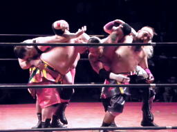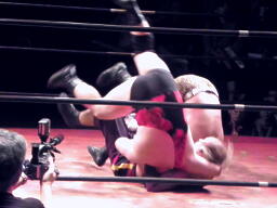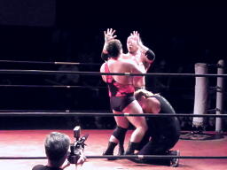 沼澤とアントンが入る。沼澤パンチ連打からロープに飛ぶ、アントンテーズプレス(右写真)、エルボードロップ、カウント2。