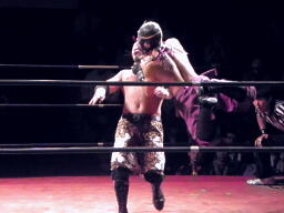 政宗をコーナー下に寝せて小林がファンタスティックフリップ(右写真)、カウント2。15分経過。