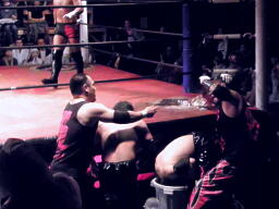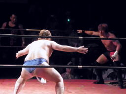 休憩時間に「今日は水を撒くひとが多いので」と100円ショップで仕入れたカッパを200円で売っていたが、その通りバラモン兄弟はいつもにも増して水を撒き散らし、TARUも負けじと水をまき、ディーノまであちこちで水を撒いていた。迷惑な。先発は稔とKen、かと思ったらそれはおとりでディーノが出る(右写真)。