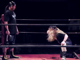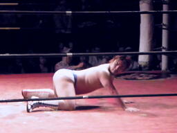 MAZADAロープに飛ぶ、ケイジャンピングハイキック。ケイロープに振る、MAZADA切り返してスパインバスターから逆エビ固めに(右写真)、ケイロープ。