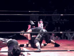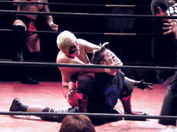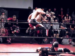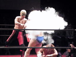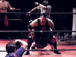 TARUドリラーを着地してKenスクールボーイ(左写真)、カウント2。このチャンスに紅白プロレス軍は3人を場外に落とす。