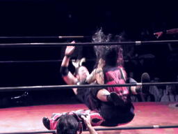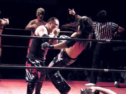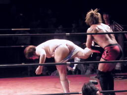 MAZADAロープに飛ぶ、ケイジャンピングハイキック(左写真)、カウント2。Kenにタッチ。
