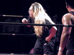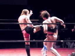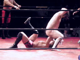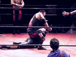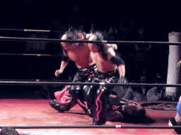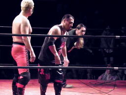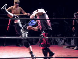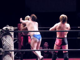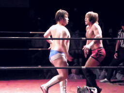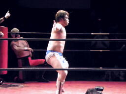 稔とヘイトが固定したKenの股間にTARUがカカト落とし(右写真)。稔とKenエルボーの打ち合い、Kenロープに飛ぶ、稔カウンターの低空ドロップキック。カウント2。10分経過。