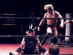 Kenをリングに戻し稔がニードロップ(右写真)。