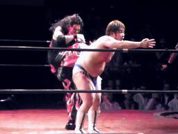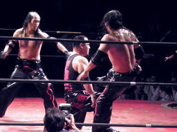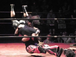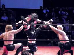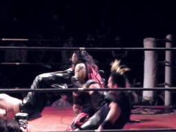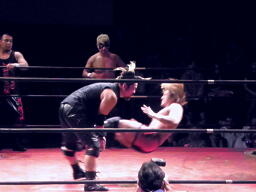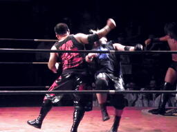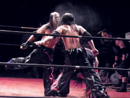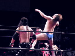 Kenブレーンバスターを切り返す(右写真)、しかし足を踏まれタッチはできす。MAZADA足を取る、Ken延髄蹴り、バラモン兄弟のどっちかにタッチ。