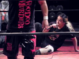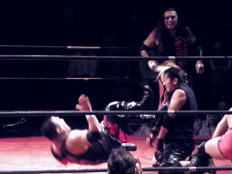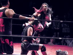 Kenパンチ連打からネックブリーカードロップ(右写真)、カウント2。さらにストンピング。ヴードゥーが入り乱戦に。