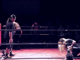 TARUディーノの尻にキック(右写真)、ディーノは自軍コーナーまで吹っ飛んでKenにタッチ。