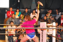 ディーノは観客の持ち物を取り上げてリングに(右写真)。