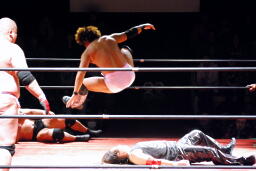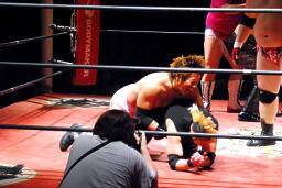 そこに関本がフロッグスプラッシュ(右写真)、2人でカット。