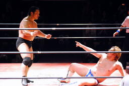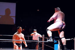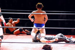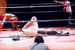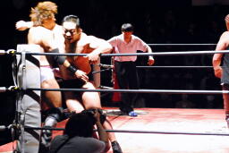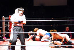 3vs2でお相手がいないためアブ小は佐渡レフェリーを襲う(左写真)。