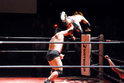 関本は持ち上げるとターンバックルに投げつける(右写真)、