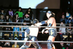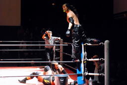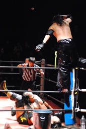 シュウチョップ(左写真)、大鷲逆水平。シュウはサミングで大鷲の視界を奪いこっそりケイにタッチ。