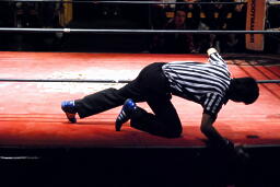 リング下に入ったバラモン兄弟を確認に行く佐渡レフェリー(左写真)。