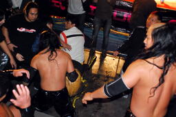 大鷲はクローズラインをかわして2人にショルダーブロック(左写真)、バラモン兄弟は場外からリング下に。