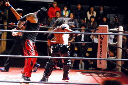 ブードゥー・マスクエルボー、大鷲コーナーに詰めて逆水平(右写真)。