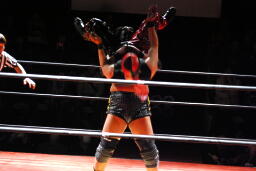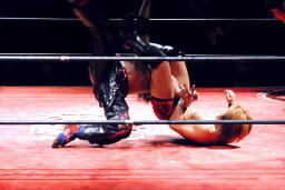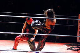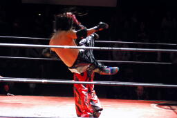 TARUリリースしてロープに飛ぶ、ケイ追いかけてミドルキック(右写真)。