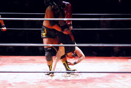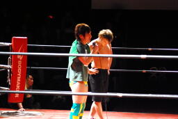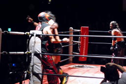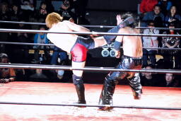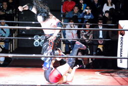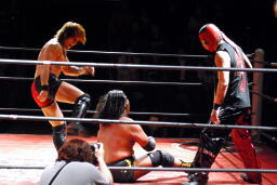 リングに戻してサッカーボールキック(右写真)、ミドルキック、カウント2。