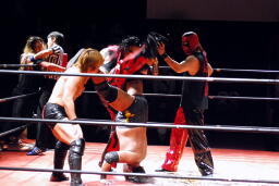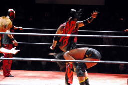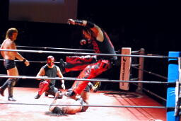 稔ニードロップ、ブードゥー・マスクはギロチンドロップ(左写真)、TARUはダイビングエルボードロップ、バラモン兄弟が2人でカット。。