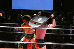 ベルトを持った政宗(左写真)。ひとまず継続が決まったからUWAタッグの防衛戦もこのリングで行われるかな。しかし何にもなしで前王者組がリターンマッチというのはなさそうだ。